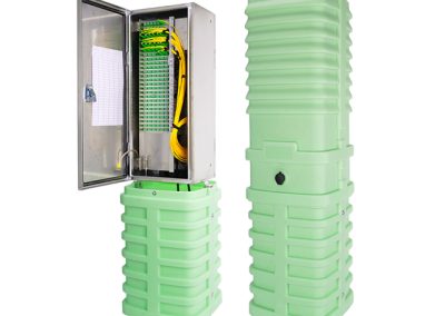 They are designed for superior environmental protection of optic fiber and copper and broadband network equipment, such as closures, CATV optical terminals, and splitter combos. The pedestal offers service providers a full range of above-grade distribution points that are easy to install and service. FiberKnct Pedestals offer years of dependable FTTx network service of splice or interconnect connectivity at the access point for the last mile drop.